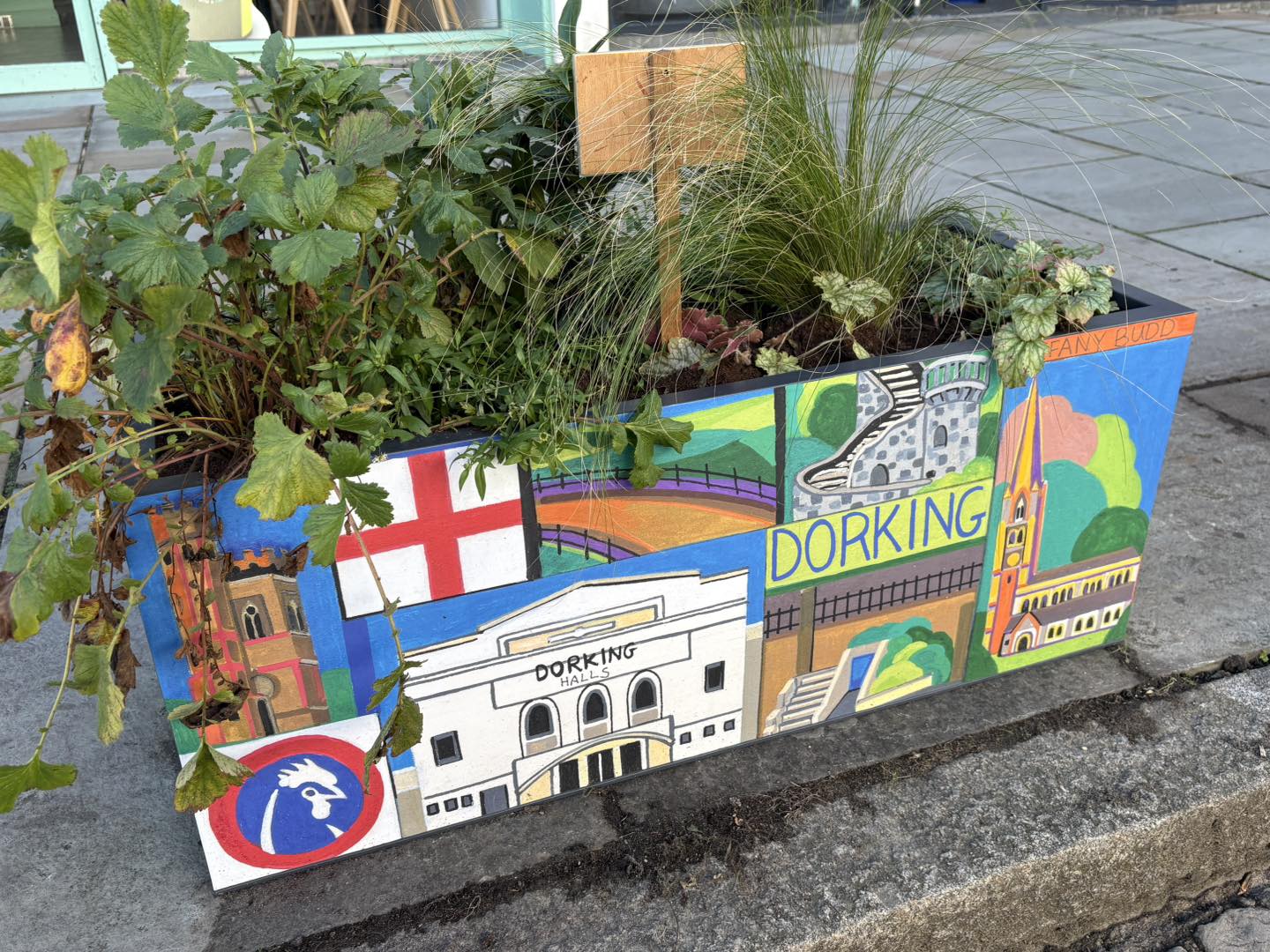 In summer 2025 Hello Dorking applied for funding from Mole Valley District Council’s Neighbourhood CIL fund to replace many of the wooden planters around the town with galvanised steel ones. We commissioned 5 local artists to design a wrap for the planters and gave them the prompt “What I love about Dorking”. The results are amazing, so varied and creative, but capturing the many facets of life in Dorking.
