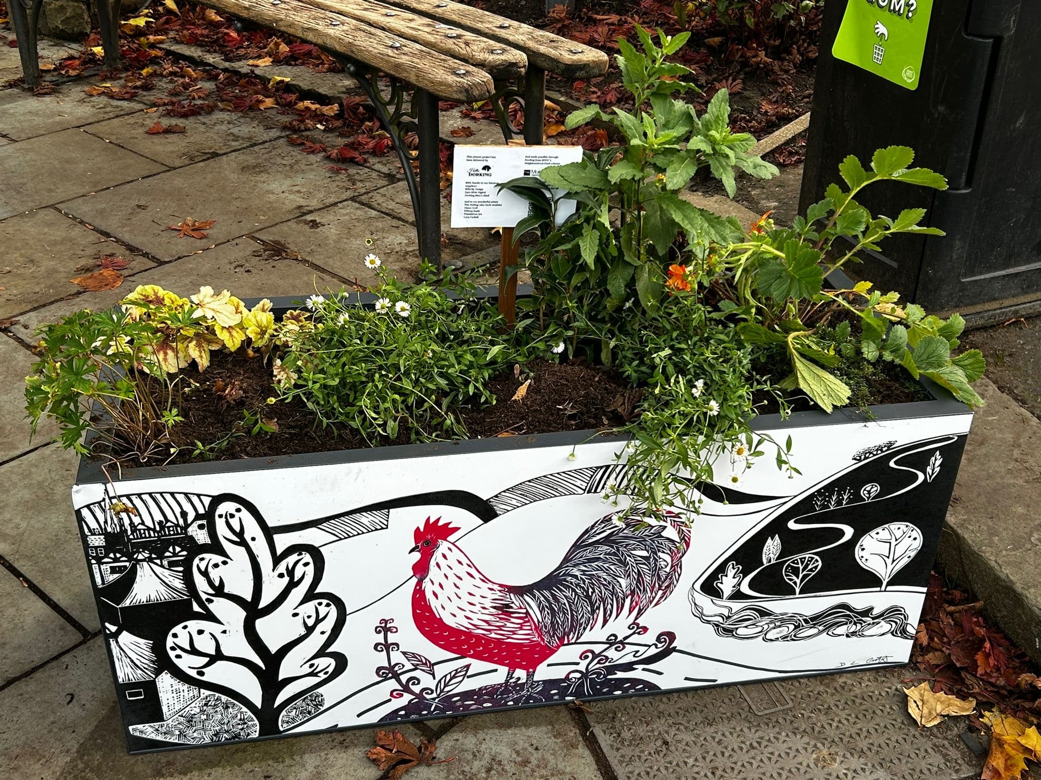 The inspiration for my designs for the planters came from the iconic Dorking cockerel and the rolling landscape of the Surrey Hills. The cockerel sculpture has been embraced by the town and has been decorated by the local guerrilla knitters to celebrate National and local events so seemed a fitting image for the town planters.