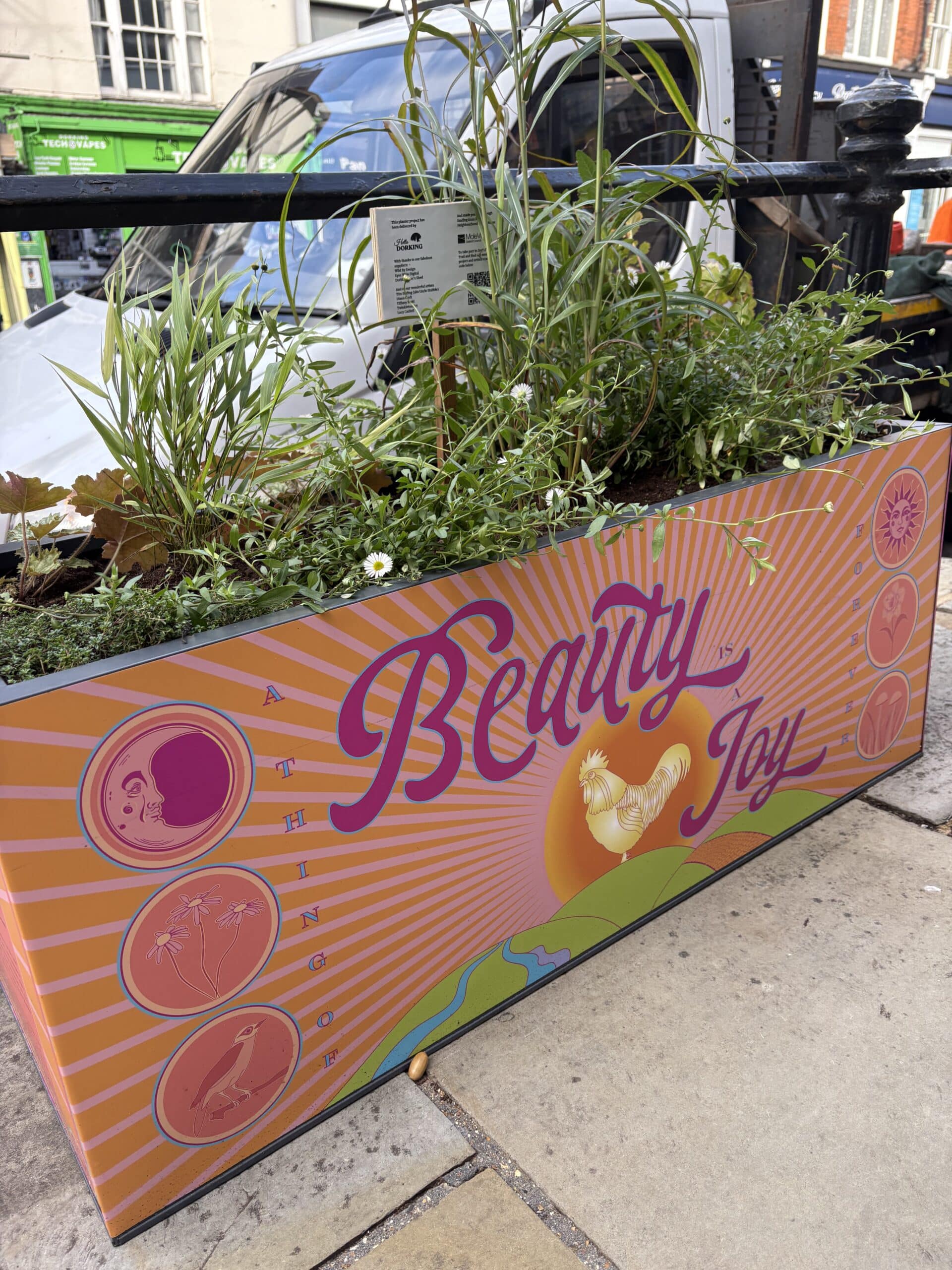 While I love working with paint, gold, and glass, I felt called to expand my digital skills for this planter project. Iโ€™m very grateful and proud to have taken the opportunity to evolve my skills and for the learnings Iโ€™ve taken from this.ย The result is now proudly sitting among incredible businesses and reflects our vibrant community. It is an honour seeing the plantersย alongside those created by brilliant local artists and to have collaborated with Hello Dorking, Eyes Wide Digital, and Wild By Design. Thank you all for making this project a reality, it has been a pleasure.