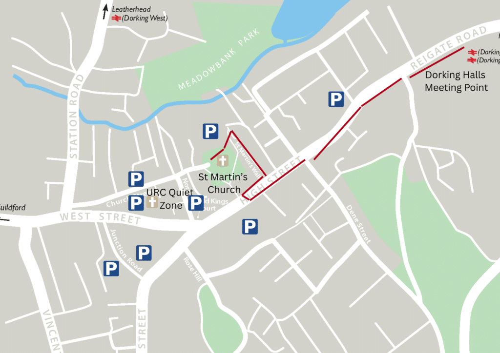 The map below shows the procession route in red from Dorking Halls to St Martin’s Church. It will involve walking along the pavements, crossing the High Street via the pelican crossing near Mountain Warehouse, Walking through St Martin’s Walk and into the Churchyard. You will then be guided into St Martin’s Church via the West Doors and will walk up the aisle. You can leave your lantern there for others to view and then come and collect it from late afternoon on Saturday or during the following week.
